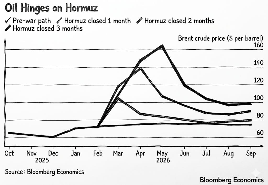 Esto es lo que Bloomberg cree que podrían ser los precios del petróleo si el estrecho de Ormuz se cierra por diferentes periodos de tiempo. 1 mes: ~$105 dólares por barril, 2 meses: ~$140, 3 meses: ~$165.