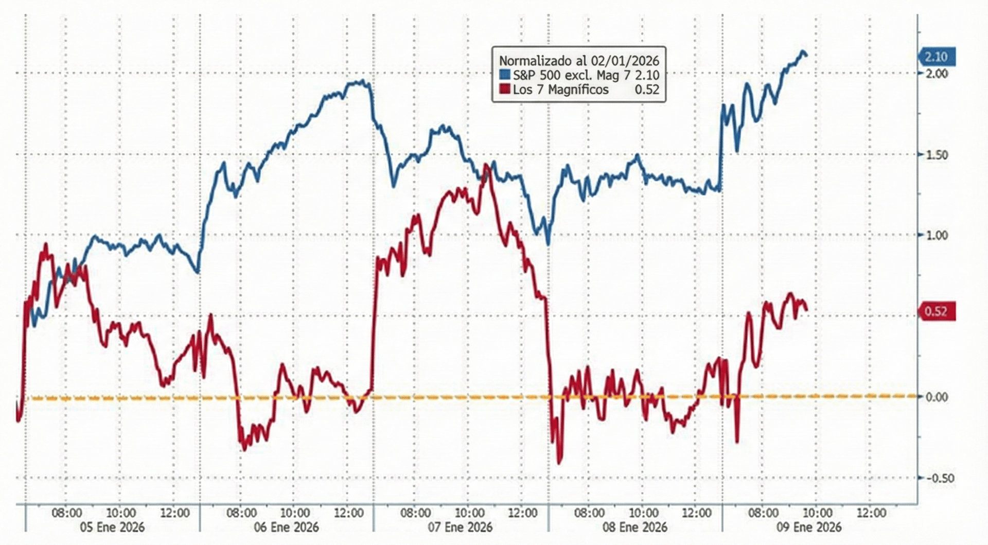 Las 7 Magníficas (rojo) vuelven a tener un rendimiento inferior al S&P 500 (azul) esta semana.