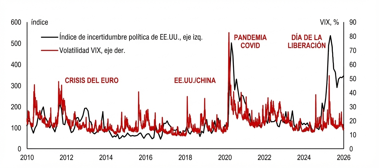 A pesar del aumento en el índice de incertidumbre política de Estados Unidos (y de los riesgos geopolíticos a nivel mundial), el índice VIX (línea roja) se mantiene bien contenido ¿Podría un shock político o geopolítico terminar por desestabilizar el panorama?