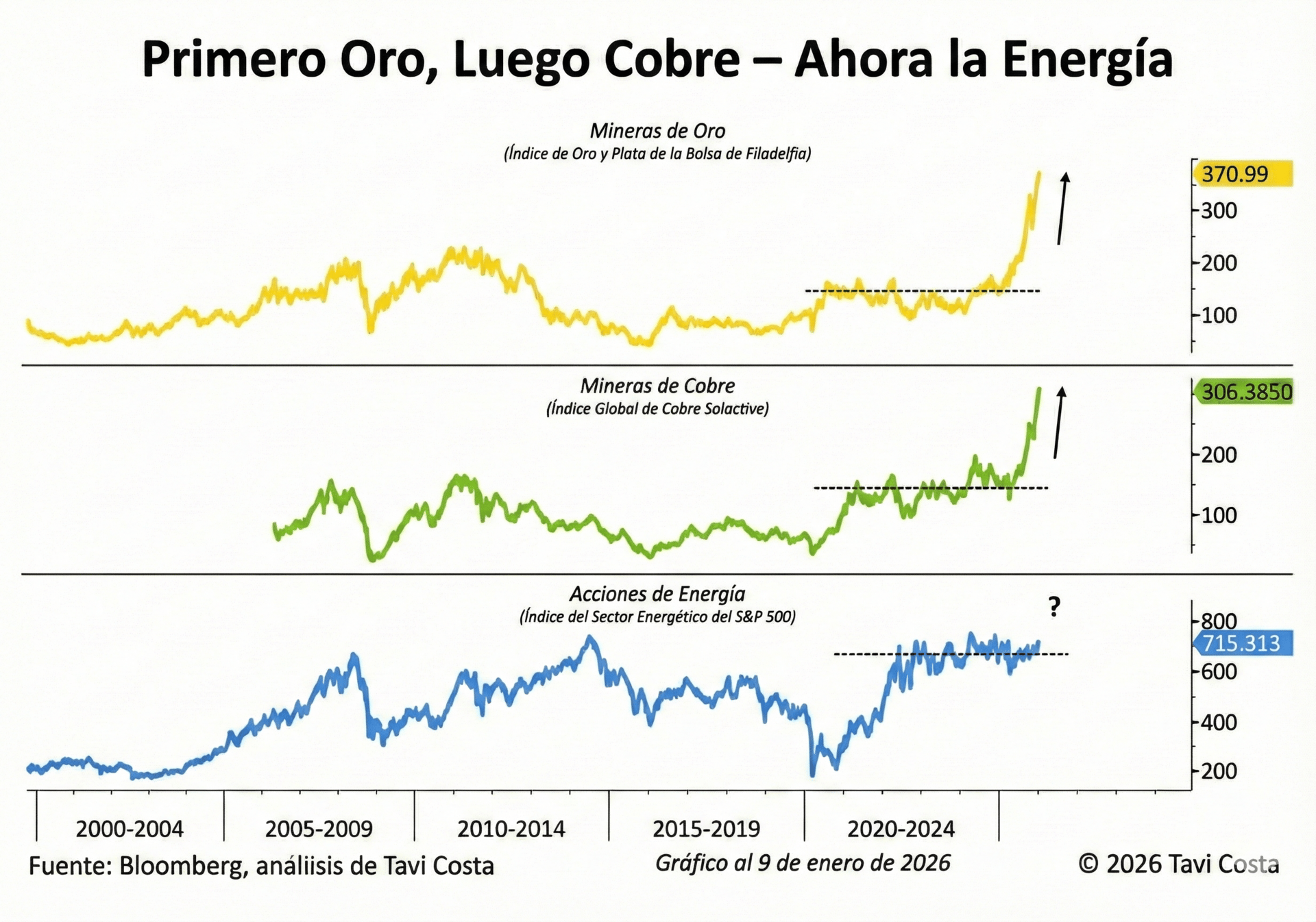 La gráfica indica que, si la historia se repite, Energía podría ser el siguiente sector en subir. El oro y el cobre ya subieron, y la energía va detrás.