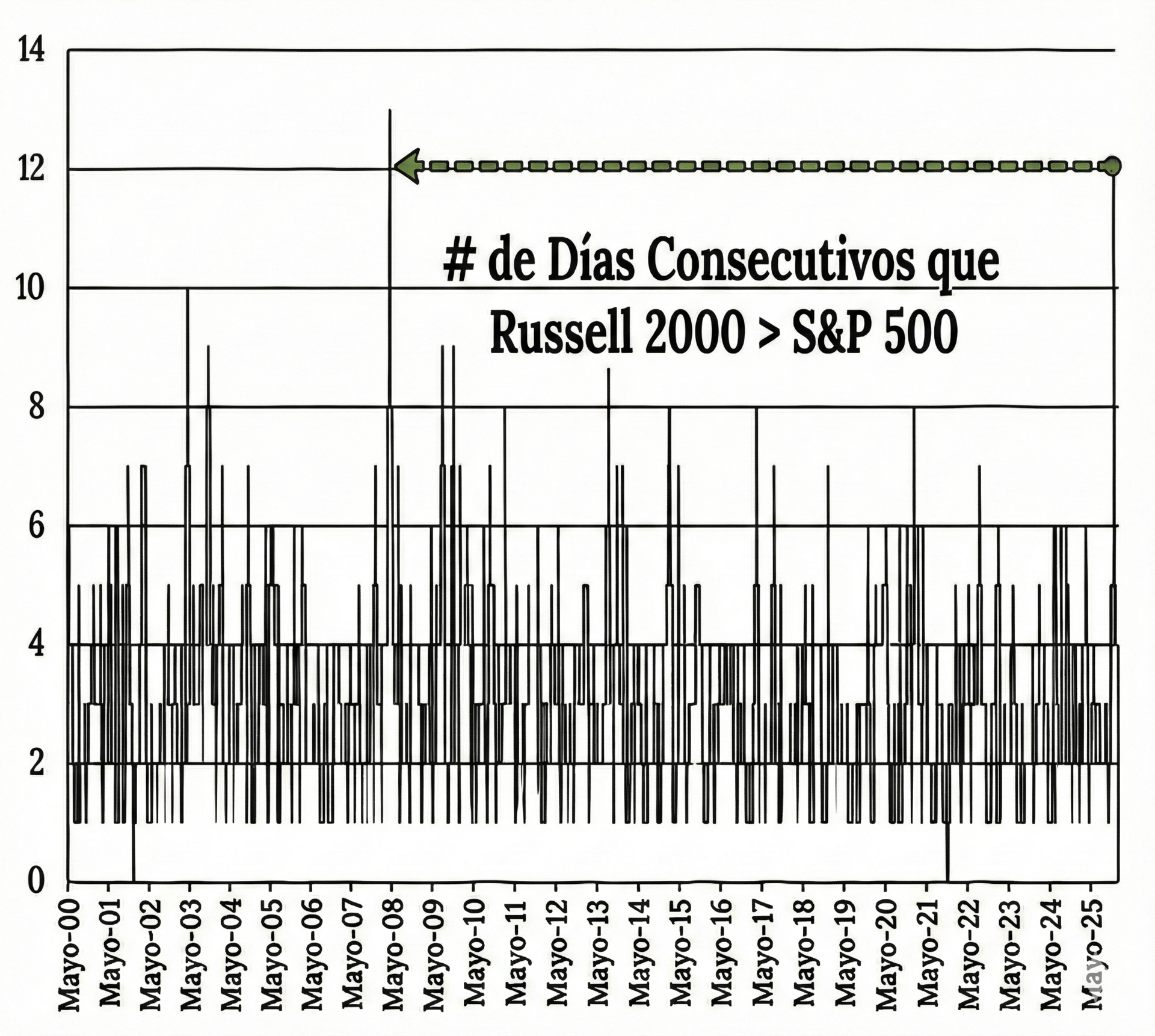 Es la racha más larga en la que las small caps le ganan a las grandes, con 12 días seguidos consecutivos, desde junio de 2008.