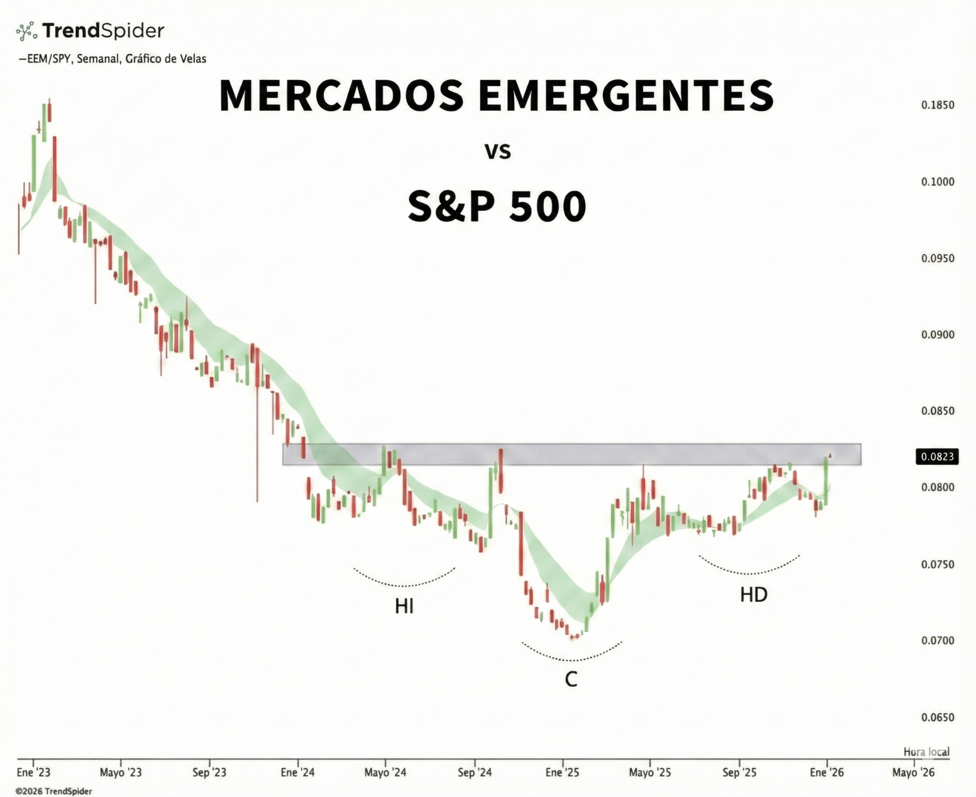 Esa barra gris es el techo. Si el precio rompe ese techo, sería una señal clara de que el retorno superior de los Emergentes que vimos en el 2025 podría continuar en el 2026.
